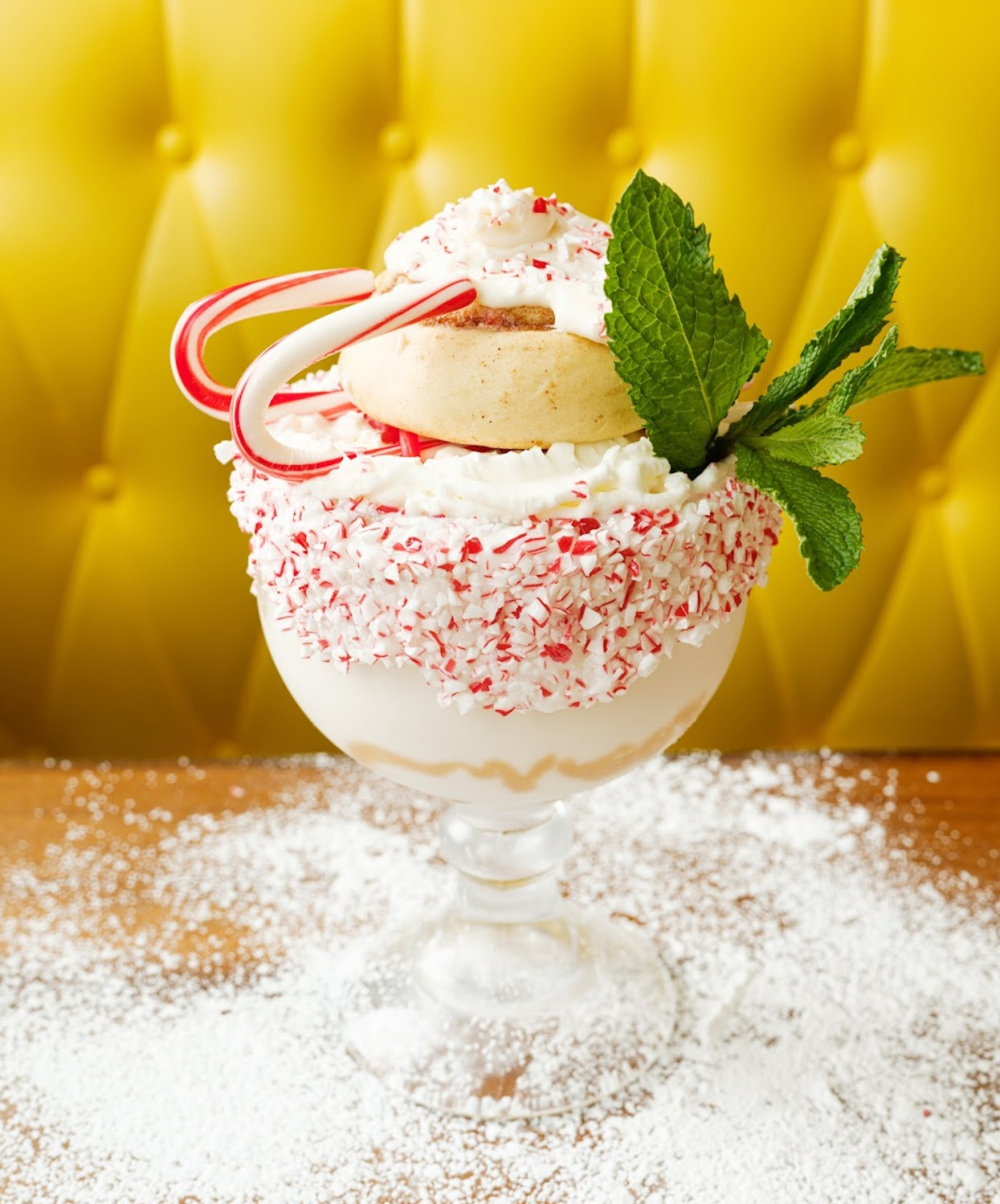 Peppermint Syrup, Whole Milk & Dark Chocolate Sauce. Ask your sever about spiking this beverage for a little extra holiday cheer!