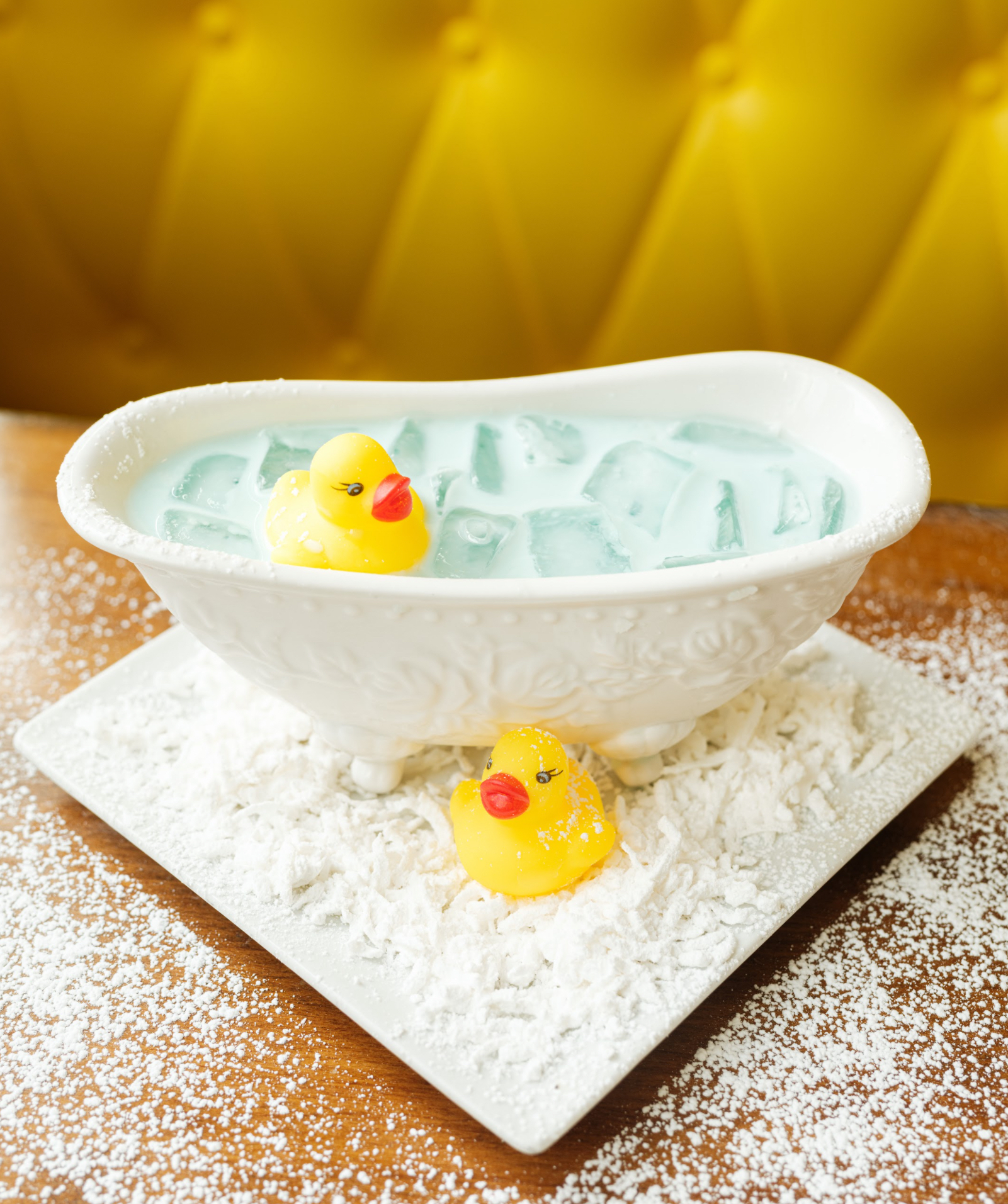 A playful, icy-blue winter soak you can sip. Creamy tequila and coconut rum shaken with vibrant blue curaçao and half-and-half for the perfect tropical-meets-frostbite cocktail. Served in your choice of a mini or large bathtub, nestled on a bed of toasted coconut “snow,” and topped with a tiny rubber duck ready for its spa day.