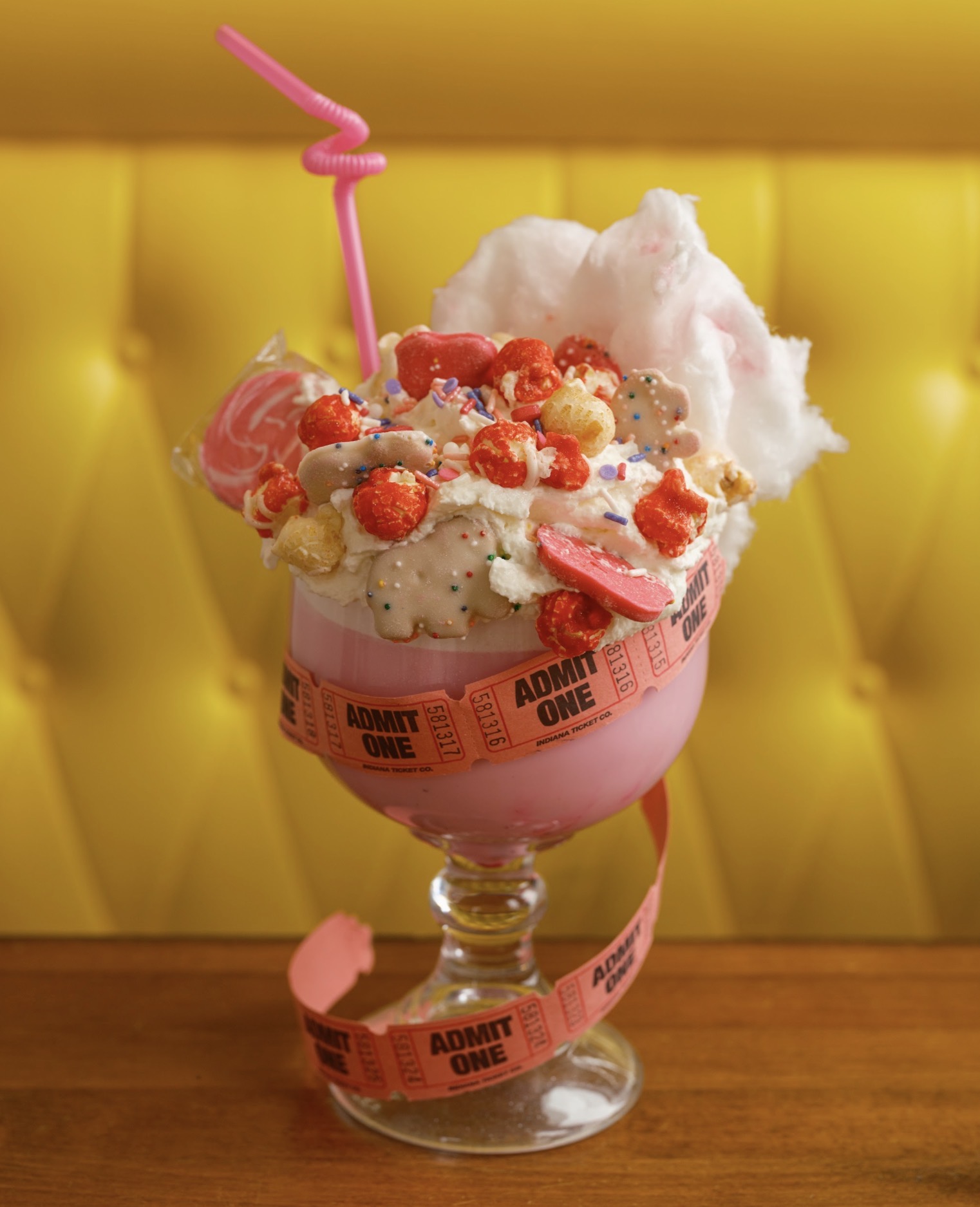 Love is in the air. Introducing our new kissing Booth Carnival milkshake it is strawberry flavored milkshake topped with cotton candy, sweet pink popcorn, frosted animal crackers, sprinkles and a pink lollipop.