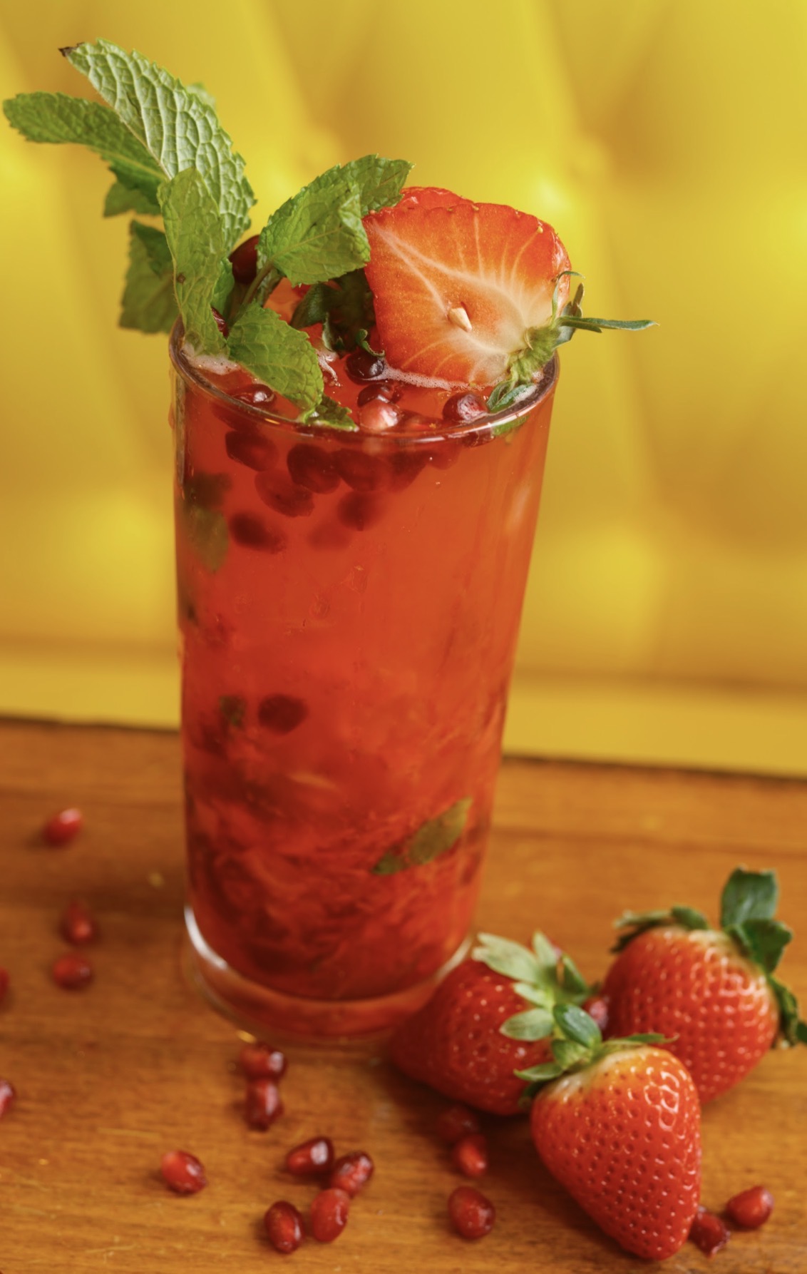 A bright, refreshing mojito made with white rum, strawberry and pomegranate syrups, fresh-squeezed lime, muddled mint, and ripe strawberries. Finished with lemon-lime soda for a light, bubbly sip that tastes like a mini vacation in a glass