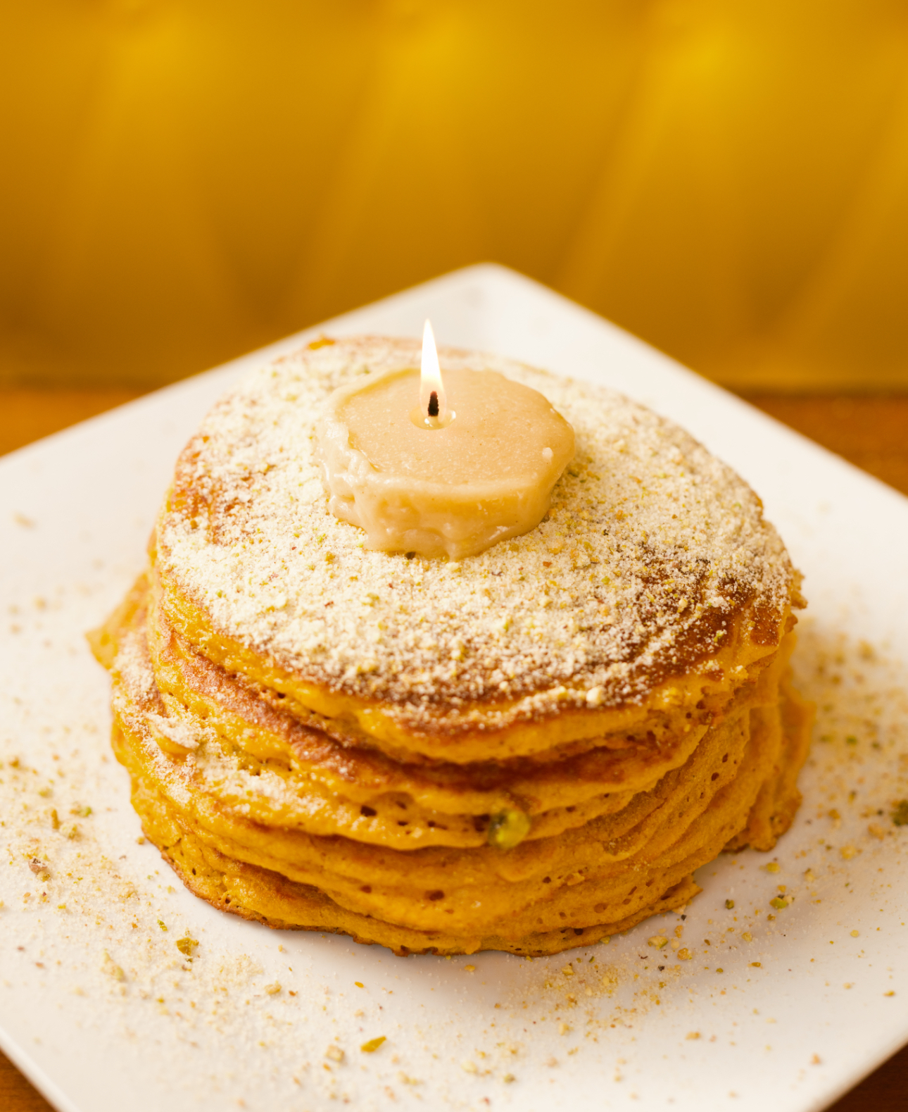 Fluffy pancakes studded with pistachios, kissed with warm cardamom, and crowned with a melting Cinnamon Toast Crunch butter candle and pistachio-cardamom sugar.