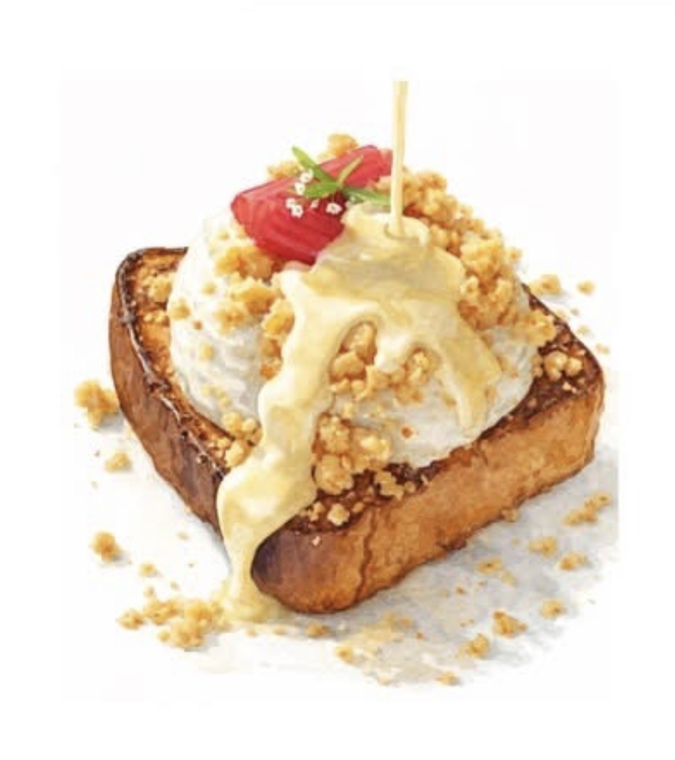 Hazelnut Ganache Stuffed and Pressed French Toast, Then Battered, Deep Fried and Topped with Dulce De Leche and Fresh Strawberry
